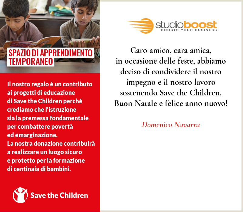 Proprio partendo da questo spirito, in occasione delle festività natalizie, StudioBoost ha deciso di sostenere un progetto di Save the Children dedicato a uno dei diritti fondamentali dell’infanzia: l’educazione e l’apprendimento.